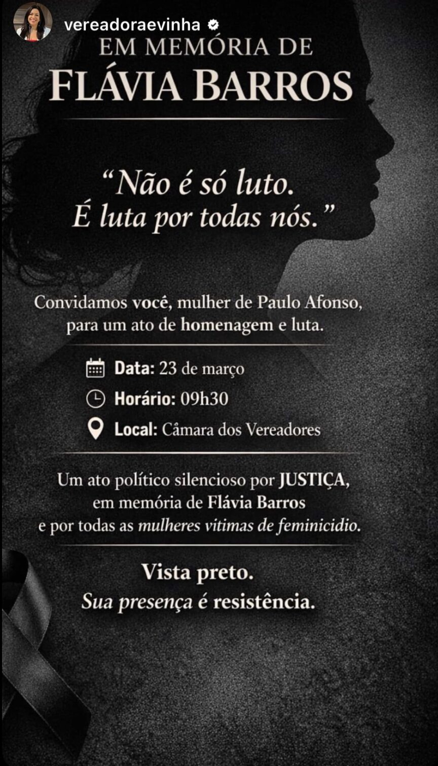 Em resposta ao crime, a vereadora Evinha Oliveira (Solidariedade) convocou um ato de homenagem e luta intitulado “Não é só luto. É luta por todas nós”. A manifestação, um ato político silencioso por justiça, está agendada para esta segunda-feira (23), às 09h30, na Câmara de Vereadores de Paulo Afonso. A organização solicitou que os participantes compareçam vestindo trajes pretos.