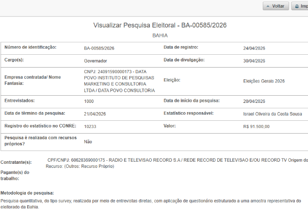 A TV Record negou, nesta segunda-feira (27), qualquer relação com a pesquisa eleitoral do Instituto Data Povo sobre a disputa pelo Governo da Bahia. O levantamento, que consta como registrado no Tribunal Superior Eleitoral (TSE), aponta que a emissora é a contratante, informação que foi contestada oficialmente pela empresa.