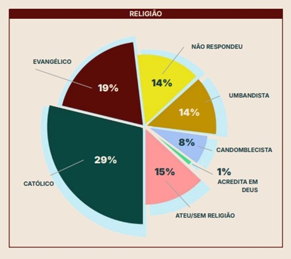 De acordo com o estudo, 71% dos entrevistados afirmaram acreditar em Deus, seja por meio de uma filiação religiosa formal ou de uma crença pessoal, sem vínculo institucional. Entre os grupos identificados, 29% se declararam católicos, enquanto 19% afirmaram ser evangélicos. A pesquisa também apontou a presença de religiões de matriz africana: 14% disseram ser umbandistas e 8% candomblecistas.