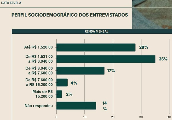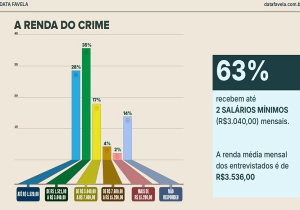 Duas amostras foram levantadas: o perfil social demográfico, onde 35% dos entrevistados afirmaram ter renda mensal de R$ 1.521,00 até R$ 3.040,00; e na amostra a renda do crime, 63% dos participantes recebem até dois salários mínimos.