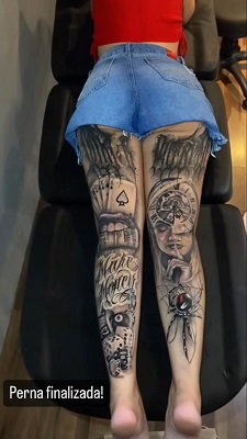 “Significados dos desenhos da minha tatuagem das pernas: na armadilha da vida, ganha quem melhor sabe jogar. O tempo e o dinheiro calam a boca de muitos”, escreveu ela.