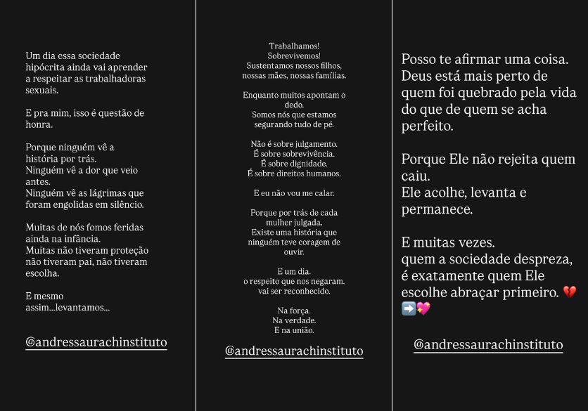 Andressa Urach anunciou a criação do ‘Instituto Andressa Urach’, projeto que pretende oferecer suporte a profissionais do sexo. Segundo ela, a iniciativa surge a partir de experiências pessoais e da percepção de falta de assistência a esse público.