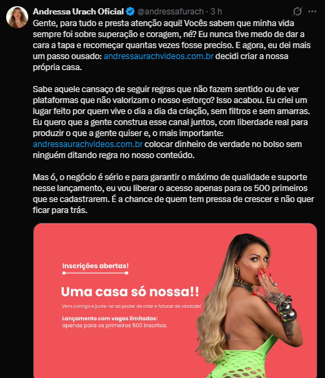 Na publicação, Urach criticou as regras adotadas por sites concorrentes e afirmou que o novo projeto nasce como alternativa para quem se sente limitado pelas diretrizes atuais. “Sabe aquele cansaço de seguir regras que não fazem sentido ou de ver plataformas que não valorizam o nosso esforço? Isso acabou”, declarou.
