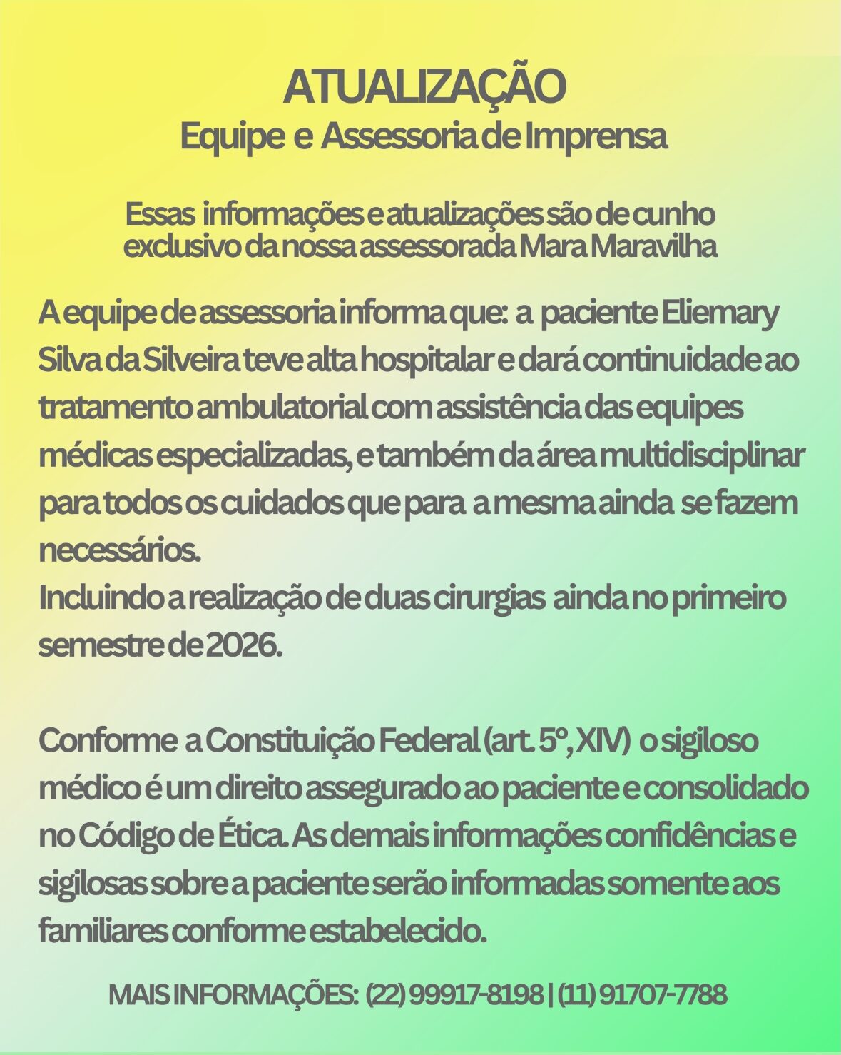 Apesar da melhora no quadro clínico, ela seguirá em acompanhamento médico rigoroso e ainda deverá enfrentar novos procedimentos. Segundo nota divulgada por sua assessoria, Mara deve continuar com o tratamento de forma ambulatorial, sendo acompanhada por equipes médicas especializadas e por profissionais de diferentes áreas da saúde.