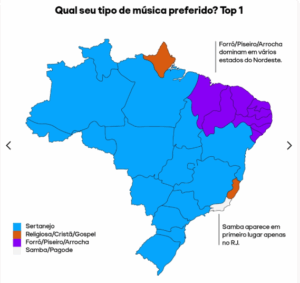 No Brasil, o sertanejo representa 29% da preferência dos brasileiros, sendo eleito também como o gênero que mais representa o país. Na segunda e terceira posição estão os gêneros Religiosa/Cristã/Gospel e Forró/Piseiro/Arrocha respectivamente.