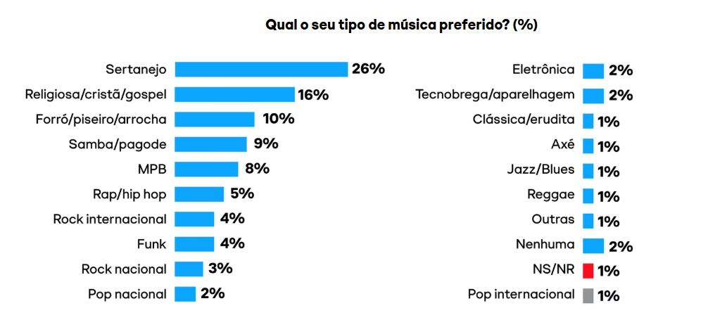 No ranking, o Axé empata com Reggae, Clássica/erudita, Jazz/Blues, Pop internacional e outras representando 1% na preferência dos brasileiros.