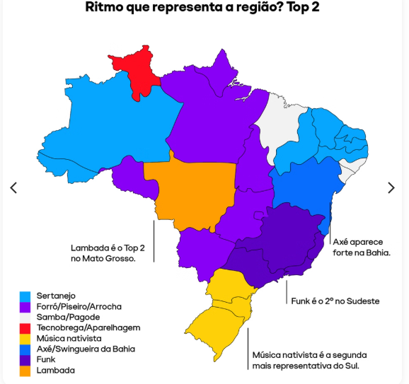 Na seleção de ritmo que representa a região, o Axé aparece em segundo em destaque na Bahia, perdendo para o Forró/Piseiro/Arrocha.