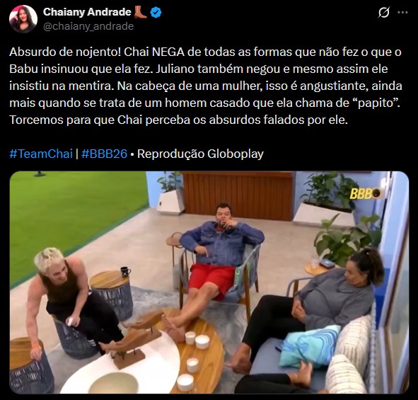 Nas redes sociais, a equipe de Chaiany classificou a acusação como grave e saiu em defesa da participante. Em nota, a assessoria destacou que ela nega veementemente a insinuação.