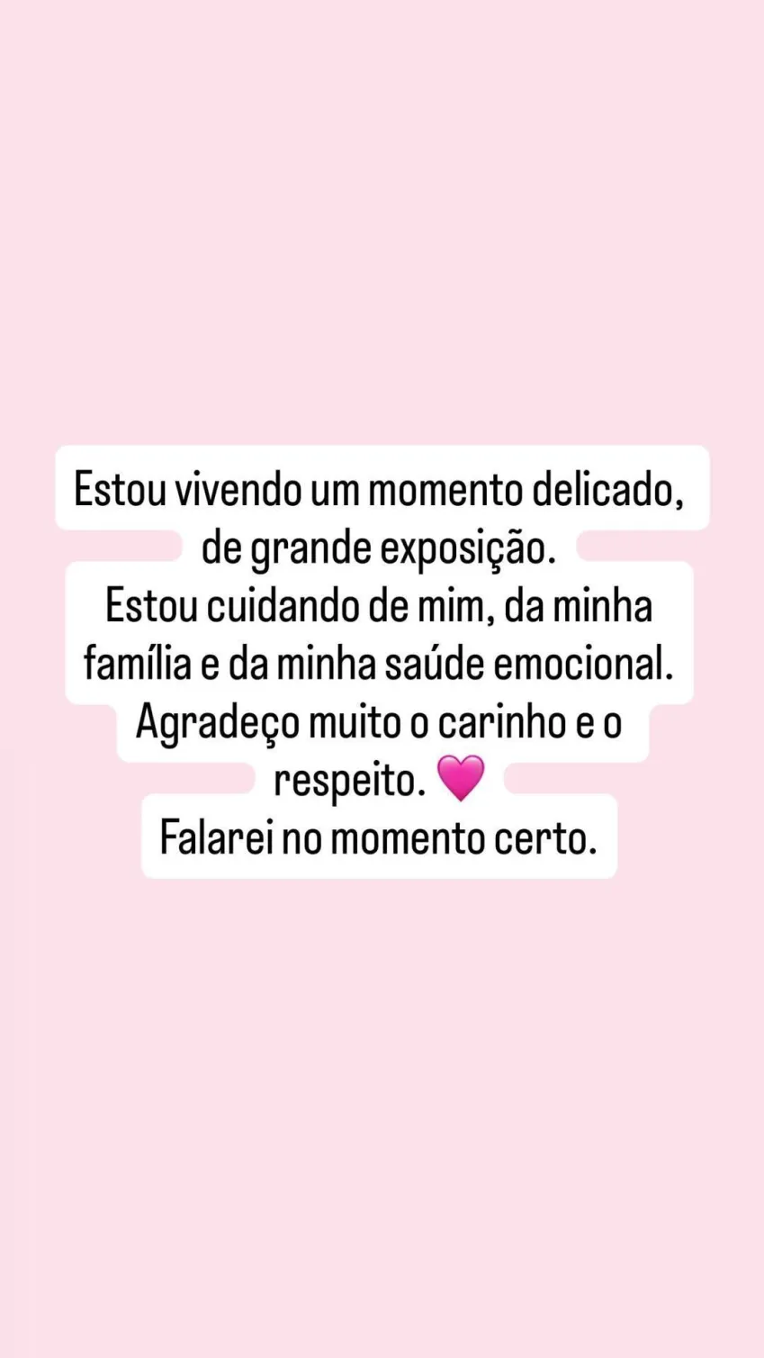 “Estou vivendo um momento delicado de grande exposição. Estou cuidando de mim, da minha família e da minha saúde emocional. Agradeço muito o carinho e o respeito. Falarei no momento certo”, escreveu no Instagram.