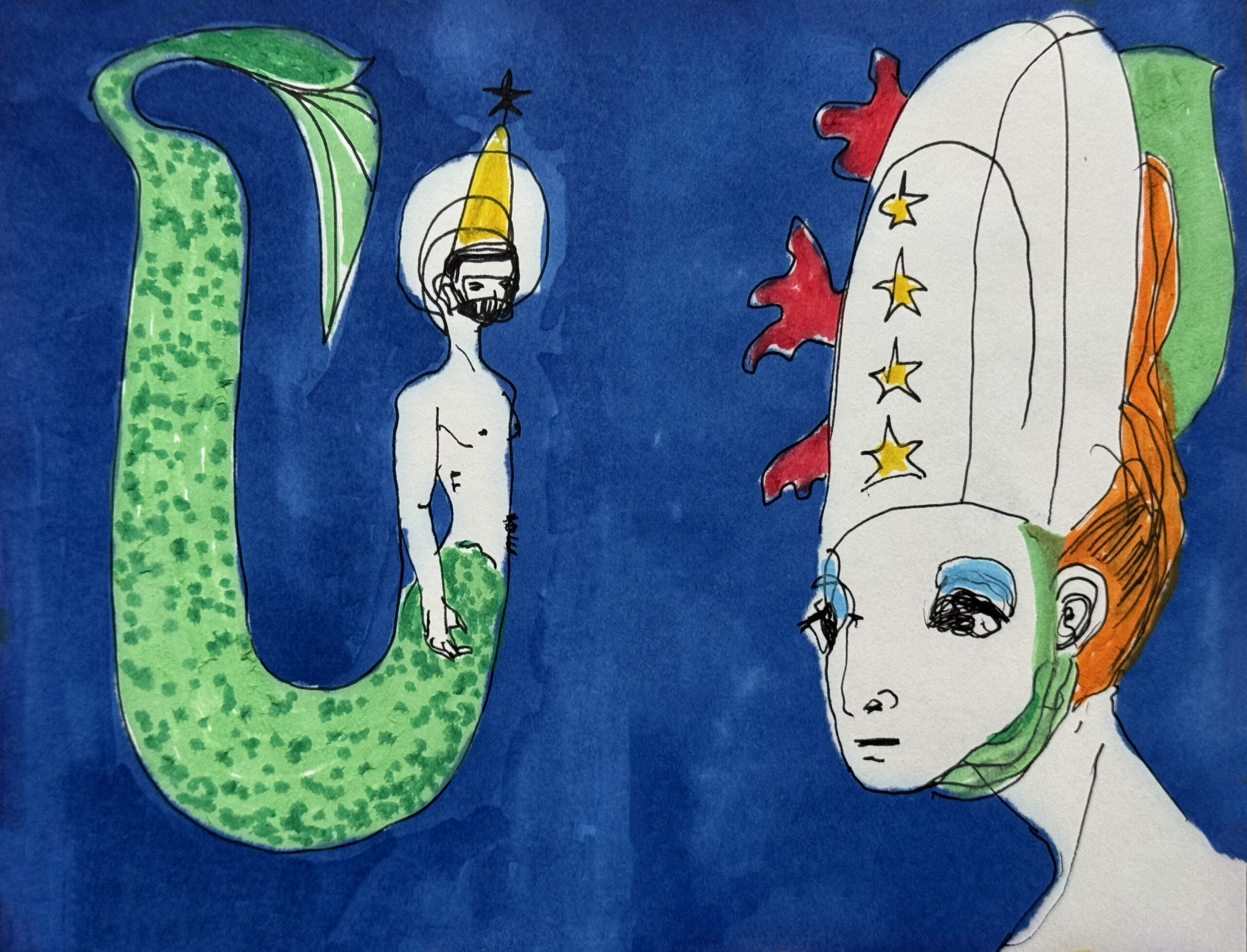 Seres humanos e animais habitam corpos híbridos e dão forma a um universo onírico e visualmente potente na exposição “pássaro peixe coração sereia”, de Chico Baldini.