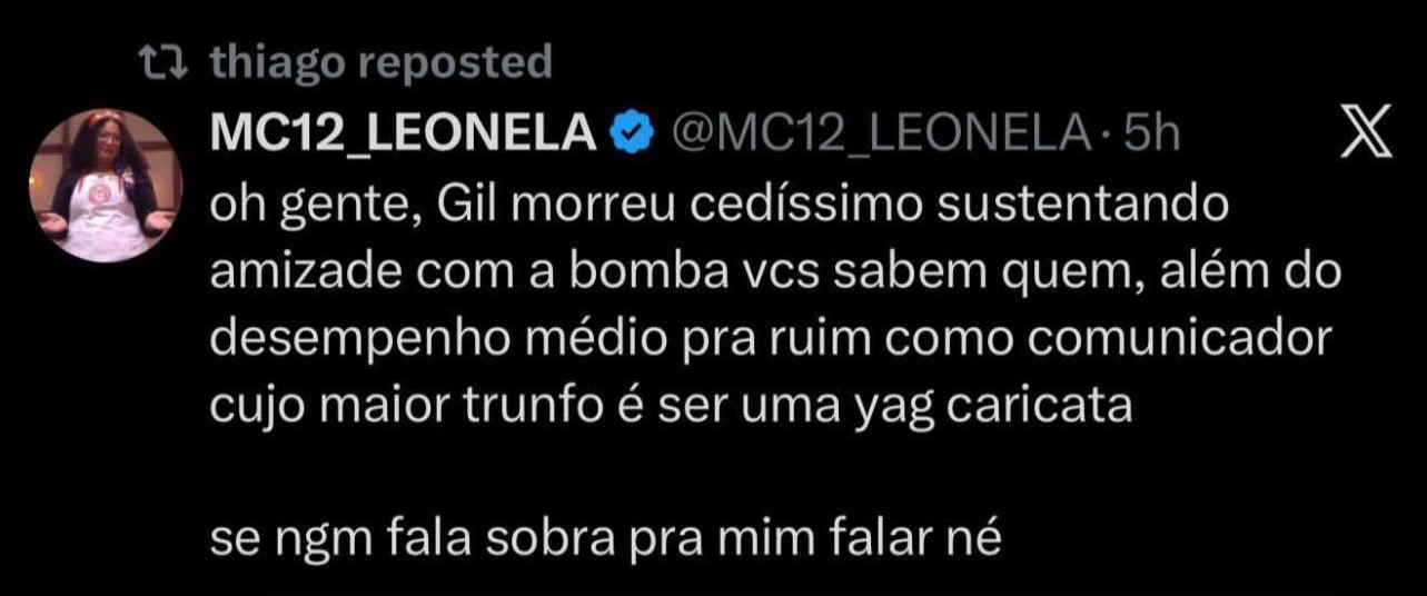 “Oh gente, Gil morreu cedíssimo sustentando amizade com a bomba vcs sabem quem, além do desempenho médio pra ruim como comunicador cujo maior trunfo é ser uma yag caricata”, escreveu Leonela ao republicar o tweet.