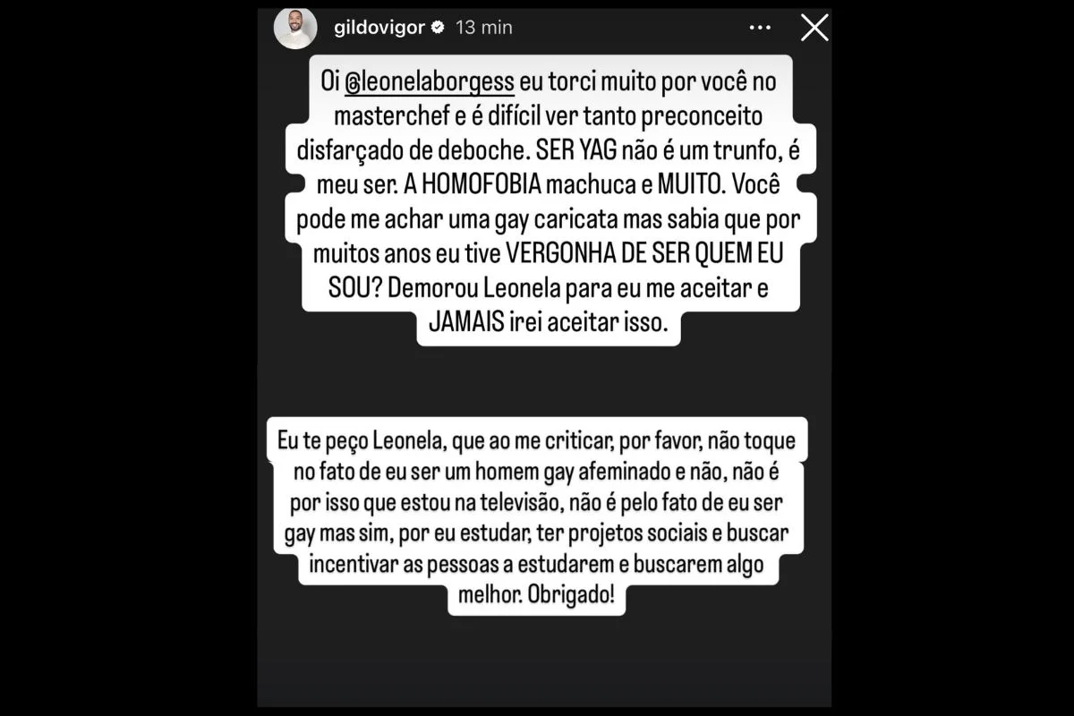 Diante da situação, Gil do Vigor se pronunciou publicamente e criticou o teor da fala. “Torci muito por você no MasterChef e é difícil ver tanto preconceito disfarçado de deboche. Ser gay não é um trunfo, é meu ser. A homofobia machuca e muito. Você pode me achar uma gay caricata, mas saiba que por muitos anos eu tive vergonha de ser quem eu sou”, afirmou.