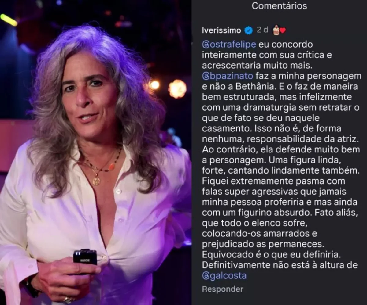 A atriz Lúcia Veríssimo usou as redes sociais para expressar insatisfação com o musical que conta a trajetória de Gal Costa, em cartaz em São Paulo. O principal incômodo da artista está na forma como seu relacionamento com a cantora, vivido nos anos 1980, foi retratado na montagem.