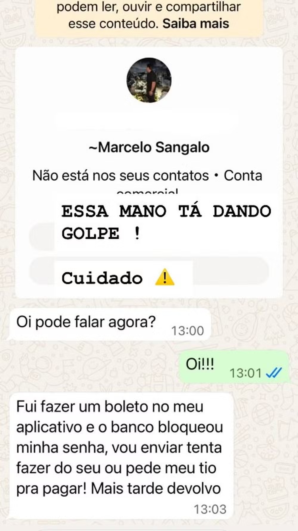 “Fui fazer um boleto no meu aplicativo e o banco bloqueou minha senha. Vou te enviar. Tenta fazer do seu ou pede a meu tio para pagar? Mais tarde devolvo”, dizia a mensagem enviada pelo estelionatário.