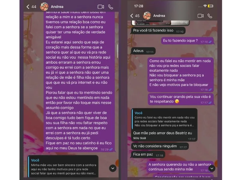 O desabafo não parou por aí. Ster Beatriz ainda sugeriu que não é a única a sofrer com o descaso de Andrea. Segundo a influencer, existe um outro irmão, que ela preferiu não identificar, que também teria sido deixado pela mãe no passado.