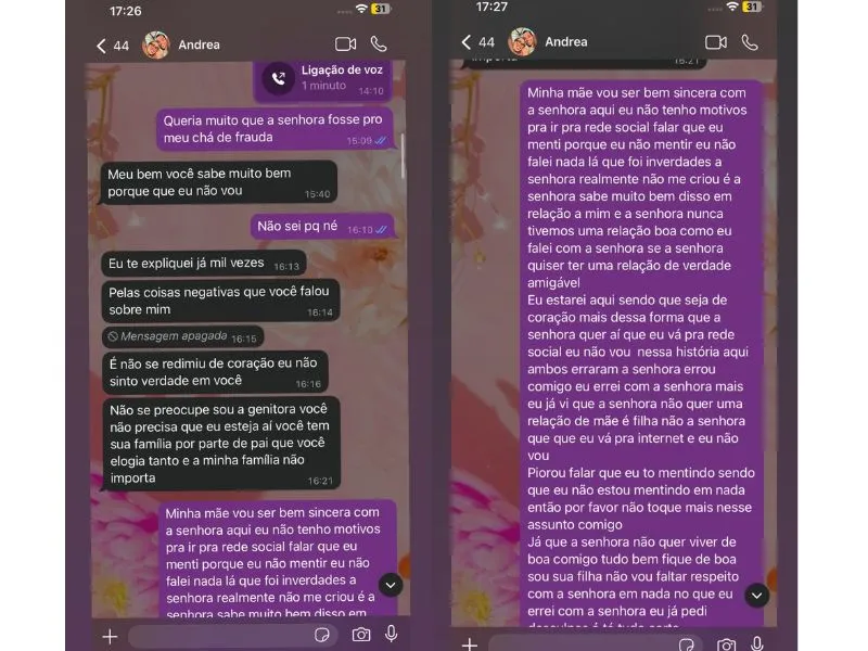 Para comprovar o que disse sobre a mãe reijeitar o neto, ela compartilhou capturas de tela mostrando a recusa de Andrea em comparecer ao chá de fraldas do menino.