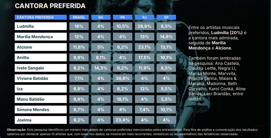 No panorama geral do Brasil, Ludmilla ocupa o topo com 20% das menções, seguida por Marília Mendonça e Alcione. Mesmo assim, o estudo destaca que as escolhas variam bastante de acordo com o território — e, na Bahia, a força de Ivete permanece soberana.