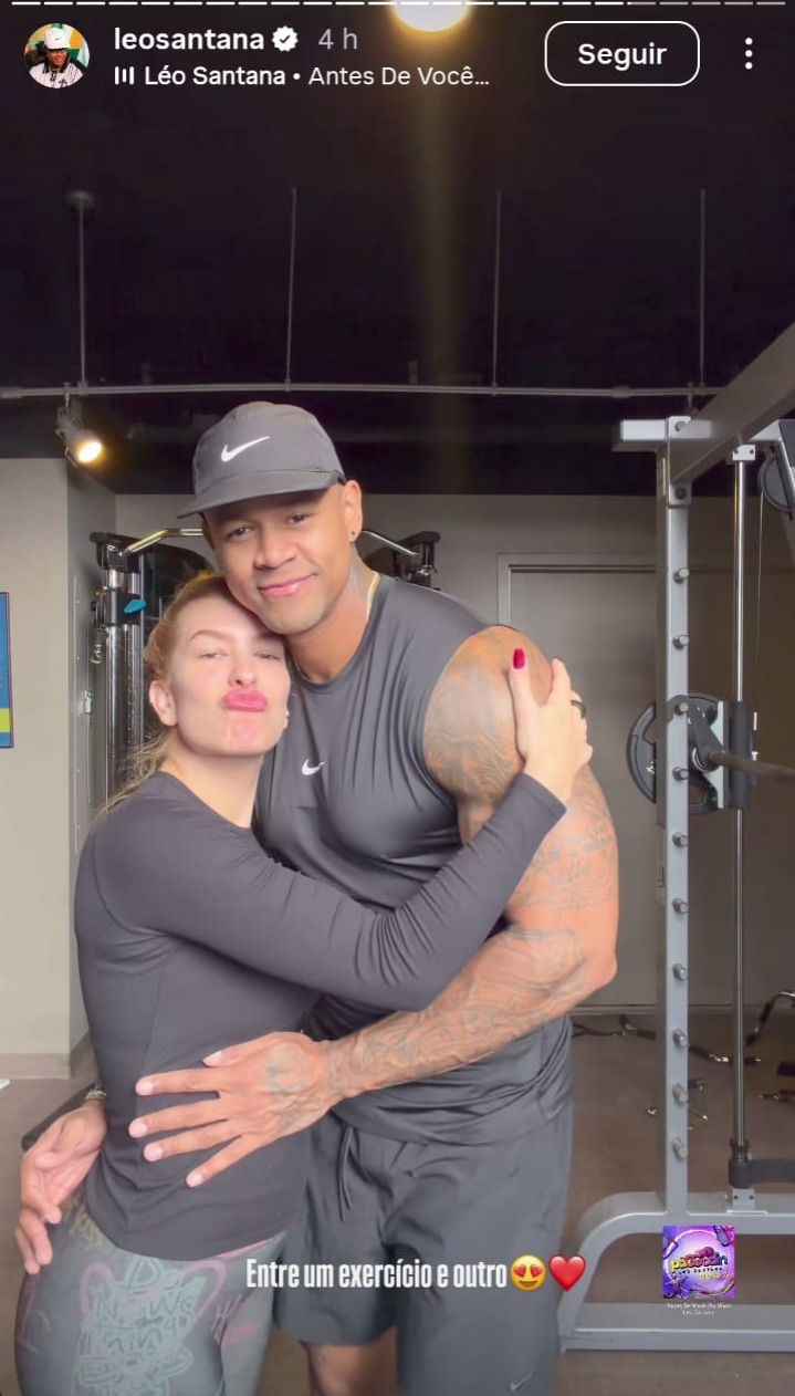 “Entre um exercício e outro”, escreveu Leo na legenda, acompanhando o registro com um emoji de coração e uma carinha apaixonada.
