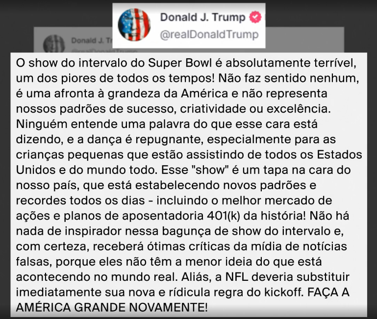 Trump acusou a NFL de permitir “propaganda ideológica” no evento e afirmou que o Super Bowl deveria ser “um espaço de exaltação do patriotismo dos Estados Unidos, não de outras bandeiras”. A reação acabou reforçando ainda mais a leitura de que o show de Bad Bunny ultrapassou o entretenimento e se consolidou como um ato político em rede nacional.