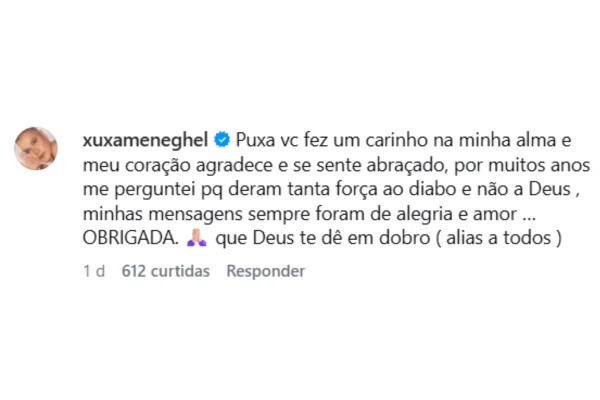 A manifestação aconteceu em uma publicação do teólogo Alan Gentil, que saiu em defesa da artista em um vídeo nas redes sociais. Ao comentar o conteúdo, Xuxa agradeceu o apoio e destacou o tipo de mensagem que sempre buscou transmitir ao público.