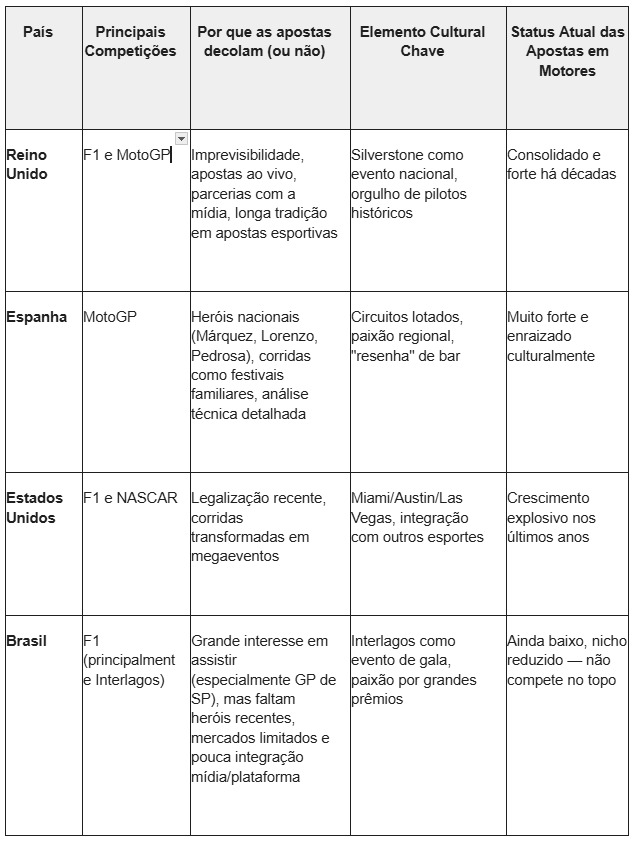 Para facilitar a comparação e entender onde o Brasil ainda fica para trás, veja esta tabela resumida do que faz as apostas em esportes a motor decolarem (ou não) nesses locais: