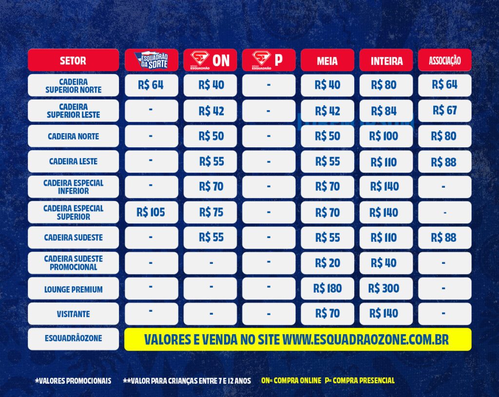 A venda de ingressos começou nesta quinta apenas para sócios da modalidade Esquadrão da Sorte. A partir desta sexta (31) inicia a comercialização para o público geral, incluindo os sócios de todas as modalidades e torcida visitante.