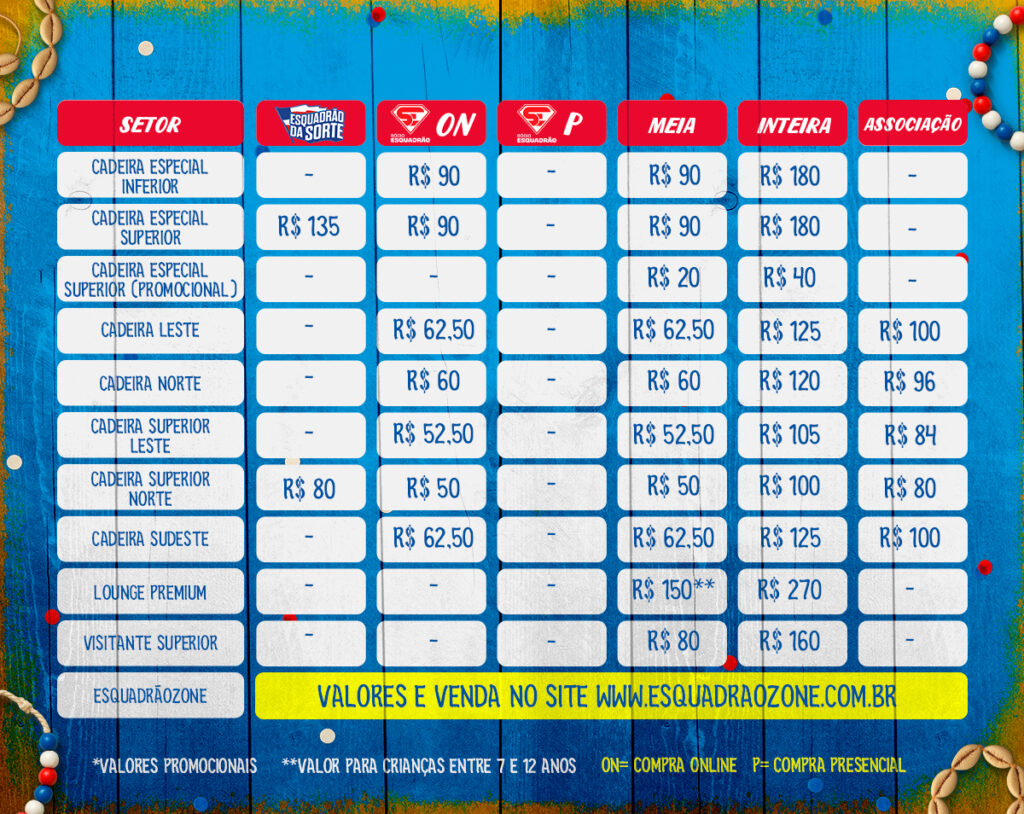 Os preços variam conforme o setor escolhido e a categoria do ingresso, com valores entre R$ 50 e R$ 270, considerando opções de meia-entrada e inteira. No Esquadrão Zone, o preço está na faixa dos R$ 500.