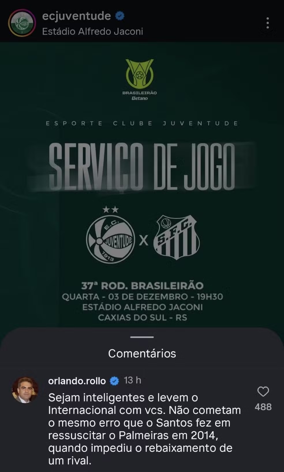 O ex-presidente do Santos, Orlando Rollo, causou polêmica nas redes sociais ao sugerir que o Juventude entregue o jogo contra o Peixe, nesta quarta-feira (3), para rebaixar o Internacional. O time paulista, o Colorado, além de Fortaleza e Vitória estão na luta pela permanência na Série A do Campeonato Brasileiro.