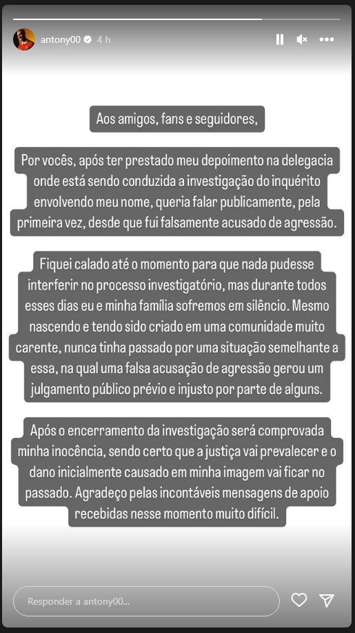 Fiquei calado até o momento para que nada pudesse interferir no processo investigatório, mas durante todos esses dias eu e minha família sofremos em silêncio […] Uma falsa acusação de agressão gerou um julgamento público prévio e injusto por parte de alguns. Após o encerramento da investigação será comprovada minha inocência, sendo certo que a Justiça vai prevalecer e o dano inicialmente causado à minha imagem vai ficar no passado”, disse Antony na plataforma.