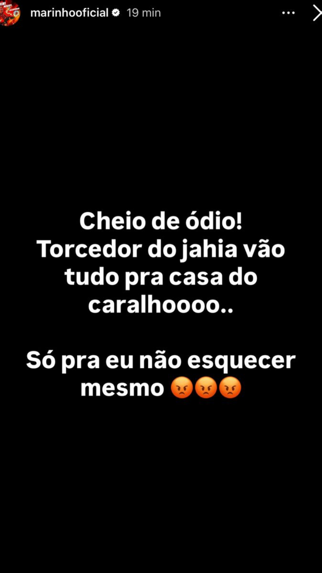 Em um story publicado no Instagram, após a partida, o jogador escreveu: “Cheio de ódio! Torcedor do jahia vão tudo pra casa do caralhoooo.. Só pra eu não esquecer mesmo”, acompanhado de emojis de raiva.