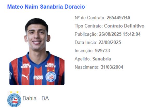 O Bahia oficializou nesta terça-feira (26) a contratação do atacante argentino Mateo Sanabria. O jogador de 21 anos teve o nome publicado no Boletim Informativo Diário (BID) da CBF e já está liberado para estrear pelo Esquadrão na próxima quinta-feira (28), contra o Fluminense, na Arena Fonte Nova, pelo jogo de ida das quartas de final da Copa do Brasil.