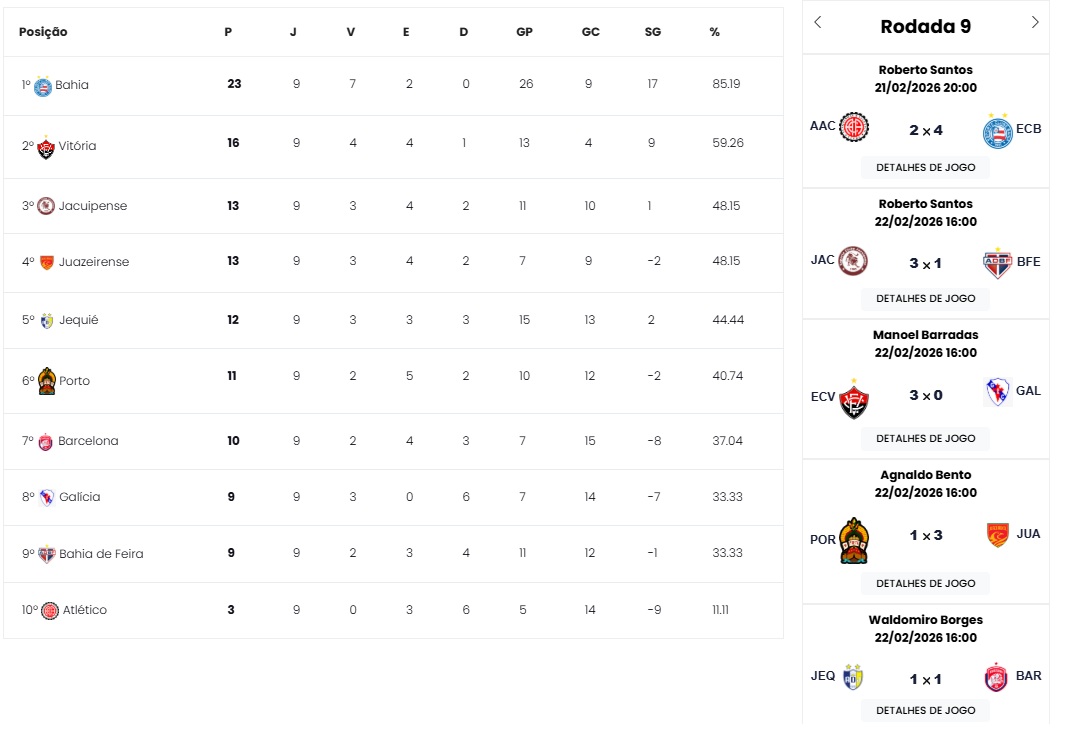 A primeira fase do Campeonato Baiano foi encerrada neste domingo (22). A competição conheceu seus quatro classificados e os dois rebaixados. Bahia, Vitória, Jacuipense e Juazeirense avançaram para a próxima etapa. Já o Bahia de Feira se juntou ao Atlético de Alagoinhas e vão disputar a Série B estadual em 2027.