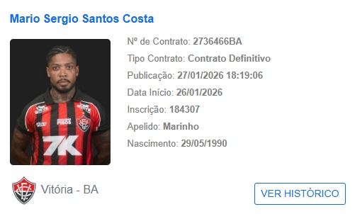 O contrato de Marinho com o Vitória vai até o fim da temporada, e a expectativa da diretoria é que o atacante agregue experiência e poderio ofensivo ao elenco ao longo do Brasileirão.
