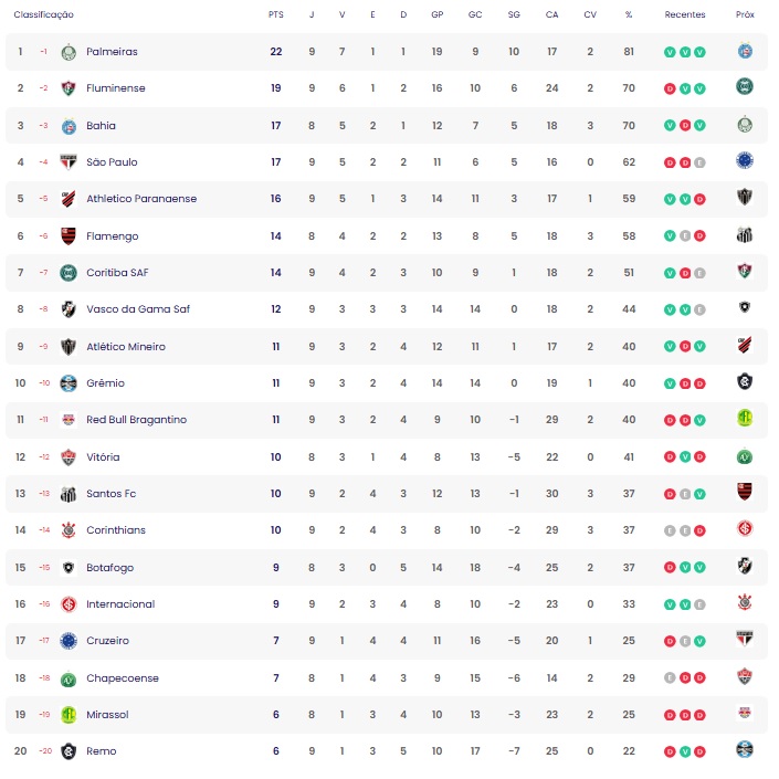 A nona rodada do Campeonato Brasileiro foi encerrada na noite desta quinta-feira (2). Com o triunfo sobre o Athletico-PR, o Bahia voltou a figurar no G-4 da tabela de classificação ao assumir o terceiro lugar com 17 pontos. Já o Vitória, que perdeu para o Cruzeiro, caiu duas posições e agora é o 12º colocado com 10. O Palmeiras manteve a liderança isolada com 22.