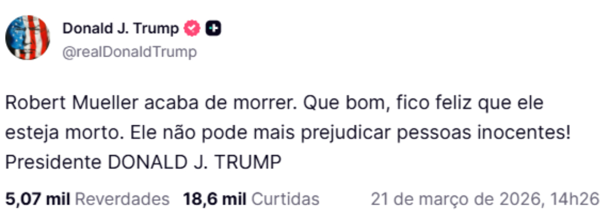 “Robert Mueller acaba de morrer. Que bom, estou contente que ele esteja morto. Ele não pode mais prejudicar pessoas inocentes!”, escreveu o presidente.