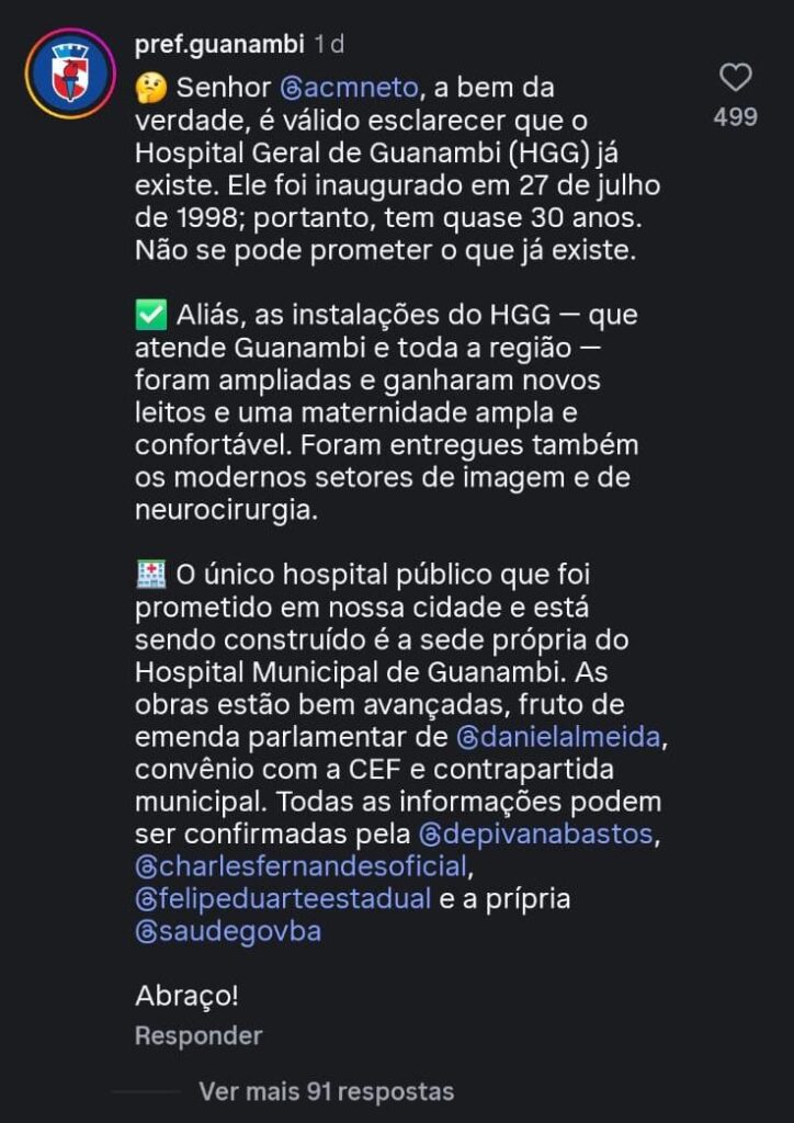 “[…]é válido esclarecer que o Hospital Geral de Guanambi (HGG) já existe. Ele foi inaugurado em 27 de julho de 1998; portanto, tem quase 30 anos. Não se pode prometer o que já existe”, escreveu a prefeitura.