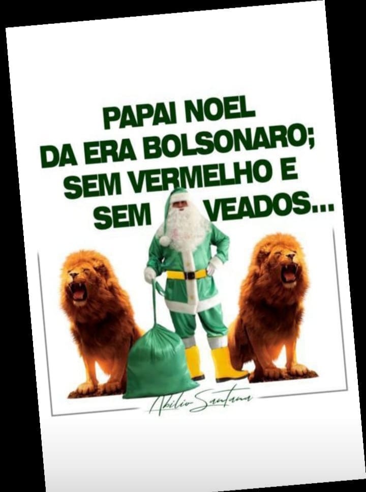 Com os dizeres “Papai Noel da Era Bolsonaro: Sem Vermelho e Sem Veados”, o card traz a imagem de um homem vestido com uma roupa verde, com cinto e botas amarelos, simbolizando Papai Noel, ao lado de leões.