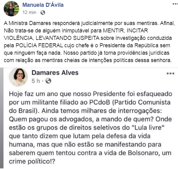 “Hoje faz um ano que nosso Presidente foi esfaqueado por um militante filiado ao PCdoB (Partido Comunista do Brasil). Ainda temos milhares de interrogações: Quem pagou os advogados, a mando de quem? Onde estão os grupos de direitos seletivos do “Lula livre” que tanto dizem que lutam pela defesa da vida humana, mas que não estão se manifestando para saberem quem tentou contra a vida de Bolsonaro, um crime político!?”, postou a ministra.