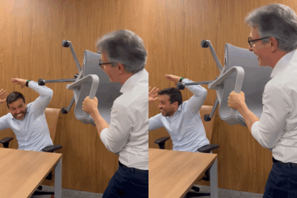 Na gravação, divulgada nas redes sociais, Zema aparece segurando uma cadeira e simula um gesto de arremesso em direção a Marçal, enquanto diz: “Olha a cadeira”. O conteúdo faz referência direta ao episódio envolvendo o apresentador José Luiz Datena, que ganhou ampla repercussão na época.