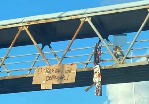 Horas antes do clássico entre Bahia e Vitória, marcado para a noite desta quinta-feira (16), cenas de ameaça entre torcidas chamaram atenção em Salvador. Um boneco vestido com trajes da Torcida Uniformizada Os Imbatíveis (TUI), organizada do Vitória, foi pendurado de cabeça para baixo na passarela da Faculdade Unijorge, na Avenida Paralela, com a frase “o terror vai começar”.