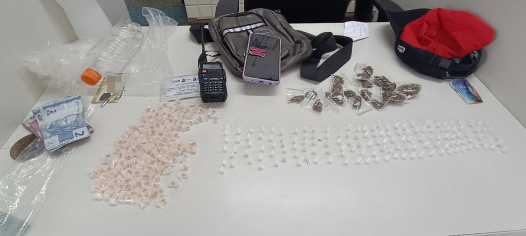 Também foram apreendidos um rádio comunicador e um aparelho celular. O suspeito e todo o material apreendido foram encaminhados à Central de Flagrantes, onde a ocorrência foi registrada para adoção das medidas legais cabíveis.