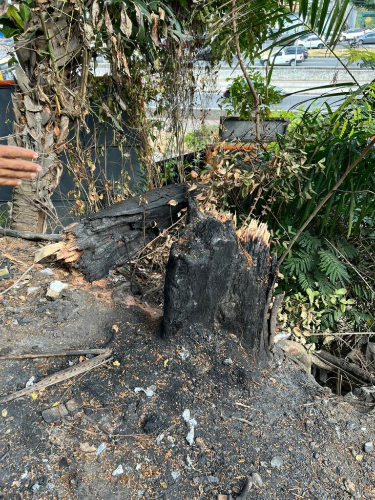 Segundo a Seman, o vegetal de grande porte que tombou após ter a base incendiada durante a madrugada.