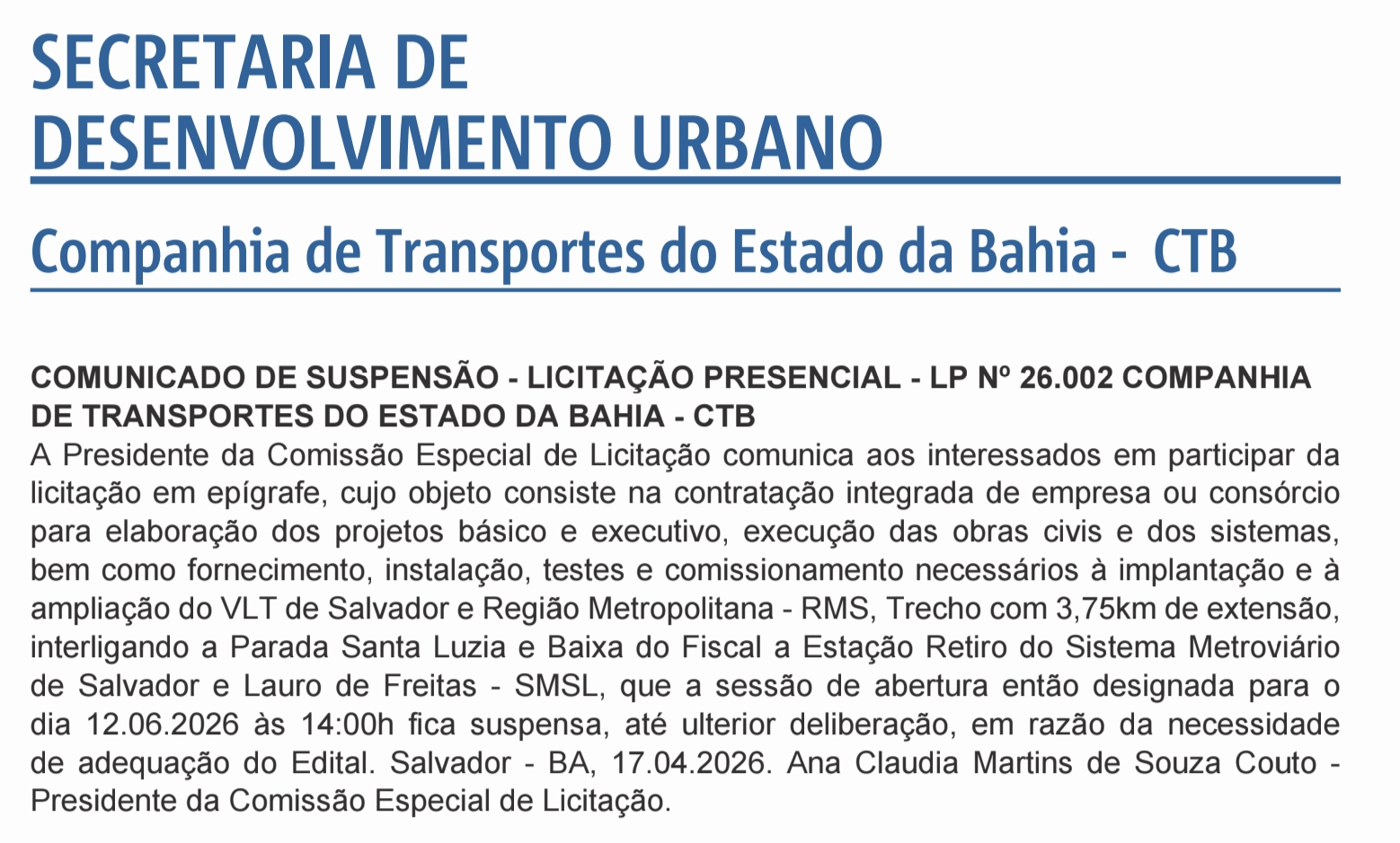 De acordo com o comunicado assinado pela presidente da Comissão Especial de Licitação, Ana Claudia Martins de Souza Couto, a sessão de abertura das propostas, agendada para o dia 12 de junho de 2026, foi suspensa em razão da “necessidade de adequação do Edital”.